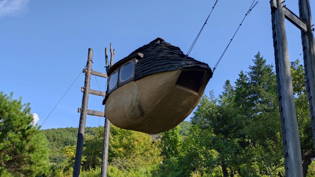 ■守屋山下山後 諏訪神社資料館から3分の所にある「空飛ぶ家」※設計:藤森信照東大名誉教授 ©藤原