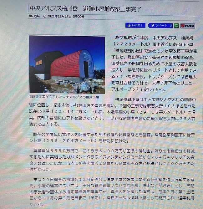 駒ヶ根市の中央アルプス「檜尾岳 避難小屋」増築完成しました。多くのMTCの仲間が小屋増築の
