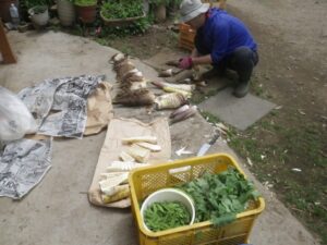 ■日程 0720新宿=0830八街/前山農園・タケノコ堀22本・きぬさや収穫・里芋植え付け
