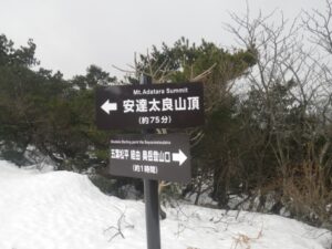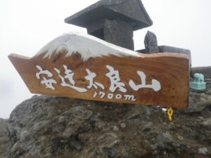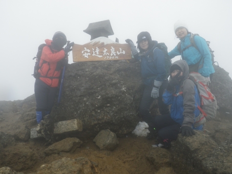 ◆山頂からさらに岩場を登ると安達太良山1700mの看板/強風