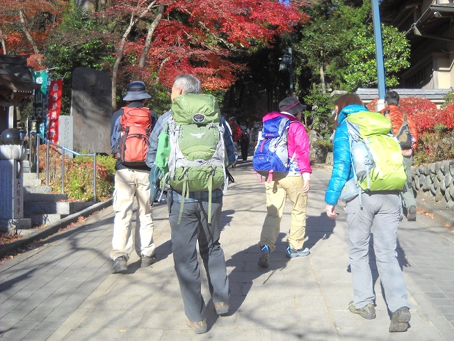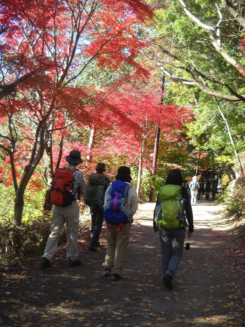 ■もっとも人気の高い1号路から山頂を目指します・頭上は真紅のもみじの葉っぱ
