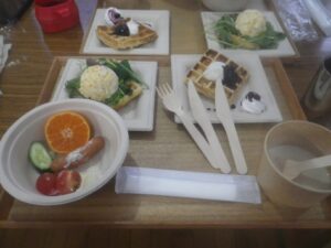 ■朝は ワッフル2個 サラダ・ウインナー チャウダースープ(もうびっくり)