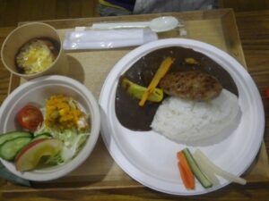 ■本日の夕食は冬季特性 ハンバーグカレー+サラダ+オニオンスープ