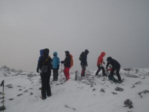 ■山頂付近の雪原登る 風吹く ■午前645山頂 御来光拝観の登山者10名