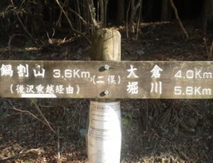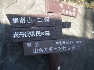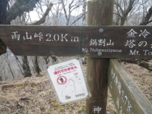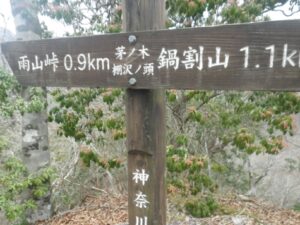 ■鍋割山の標識 ■雨山峠のトレイル 上級者向き/注意勧告