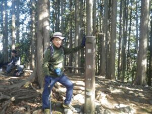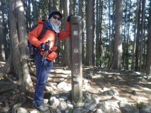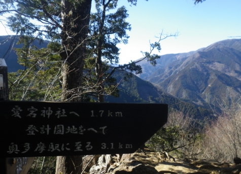 ■下山の標識 御前山1405m 右手は東京都産高峰「雲取山2017m」に続く石尾根/七ツ石山1757m