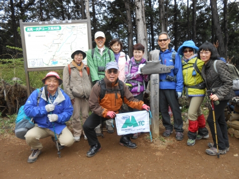 ▼草戸山頂から下った草戸峠で新入生歓迎ハイクの大学生グループと談笑