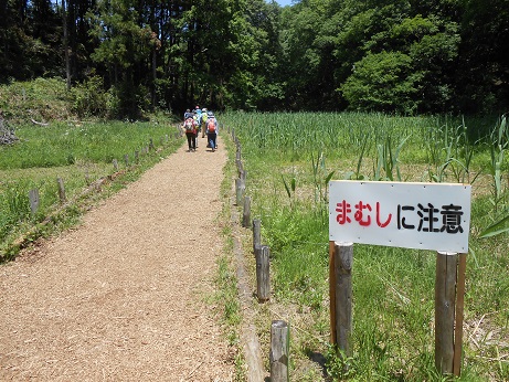 ▼天覧山を下り「まむし注意」の看板が立つ湿原を行く