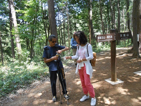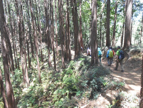 ▼木漏れ日の中、緩やかな山道を多峯主山に向かう
