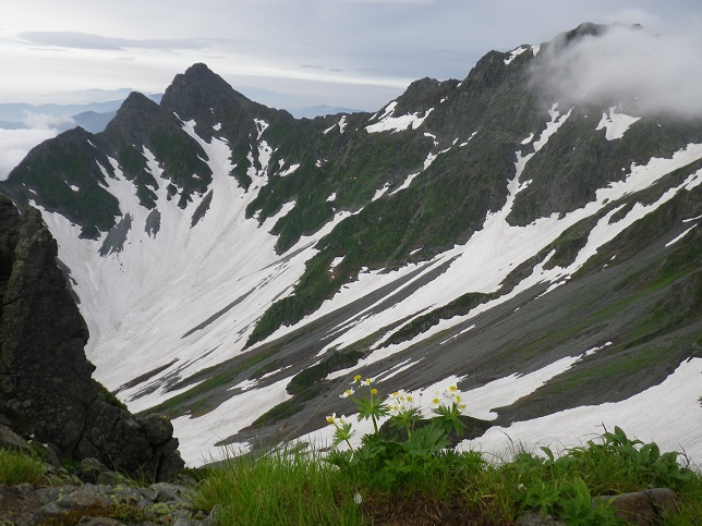 ~薬師岳2962m/立山 ■頂上直下「南稜テラス/テント場 からハクサンイチゲと奥穂高3190m/前穂高3090m」