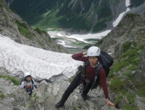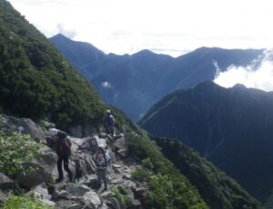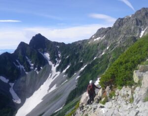 ■南陵鎖場へ ■前穂高北尾根をバックにトレイルを行く