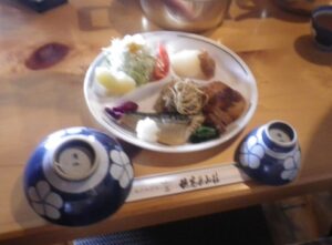 ■山荘のテラス/長野県側 眼下に涸沢のテント場 ■夕食は魚中心