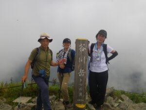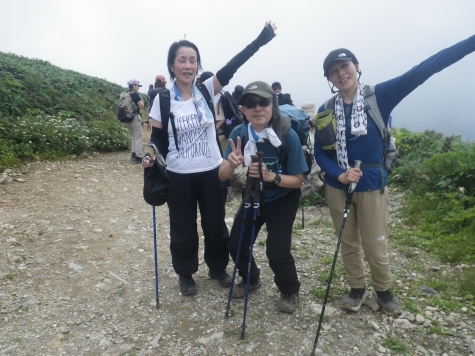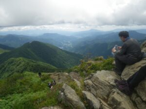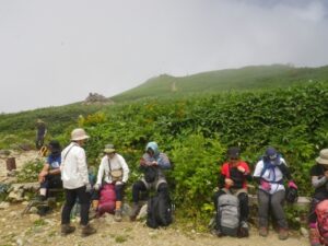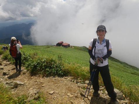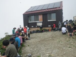 ■肩の小屋には多くの登山者 家族も多い ■小屋から上を見ると山頂が見える