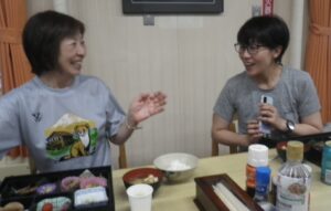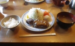 ■1700夕食 ハンバーグにサラダ 味噌汁+スイーツ付き ■カイコ棚の部屋 80名満員