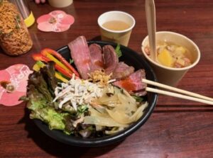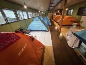 ■ヒュッテ1Fは1名用のテント ■夕食はデビグラタンソースハンバーグとオニオンスープ